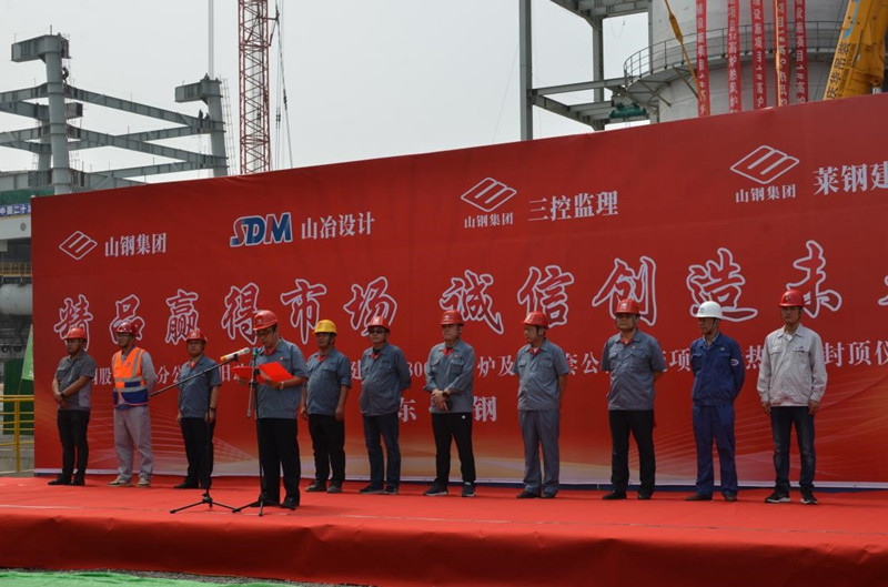 2020年6月28日9點(diǎn)50分,公司總包的山鋼股份萊蕪分公司新舊動能轉(zhuǎn)換項(xiàng)目1號3800m3高爐熱風(fēng)爐順利封頂!山鋼股份萊蕪分公司新舊動能轉(zhuǎn)換項(xiàng)目工程指揮部副指揮孫建設(shè),山鋼股份萊蕪分公司煉鐵廠經(jīng)理、高爐工程項(xiàng)目經(jīng)理部經(jīng)理張明,新舊動能轉(zhuǎn)換項(xiàng)目工程指揮部高爐工程項(xiàng)目經(jīng)理部常務(wù)副經(jīng)理賈友劍,萊蕪三控冶金建設(shè)監(jiān)理事務(wù)所經(jīng)理沈桂聯(lián),我公司黨委書記、副總經(jīng)理谷卓奇,萊蕪鋼鐵集團(tuán)建筑安裝工程有限公司黨委書記、董事長時(shí)元海,萊蕪鋼鐵集團(tuán)建筑安裝工程有限公司副經(jīng)理梁博,上海二十冶萊鋼高爐項(xiàng)目部項(xiàng)目經(jīng)理李虎,中國十九冶萊鋼高爐公輔項(xiàng)目部項(xiàng)目副經(jīng)理田澤龍,河北省安萊鋼高爐噴煤及鑄鐵機(jī)項(xiàng)目部項(xiàng)目經(jīng)理王紅帥,中十冶萊鋼主控樓項(xiàng)目部項(xiàng)目經(jīng)理馬少華出席了儀式。