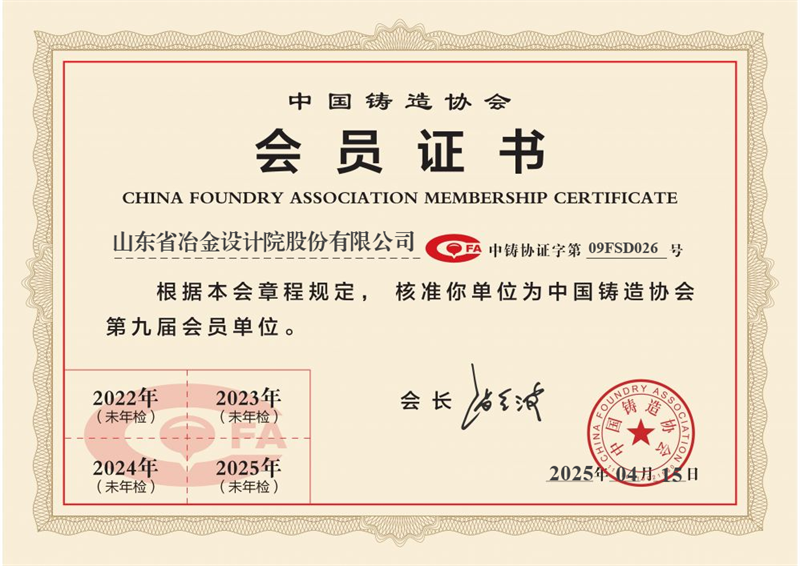 經(jīng)過前期準備工作及入會申請,4月15日中國鑄造協(xié)會核準山冶設計成為協(xié)會會員單位(會員編號09FSD026)。